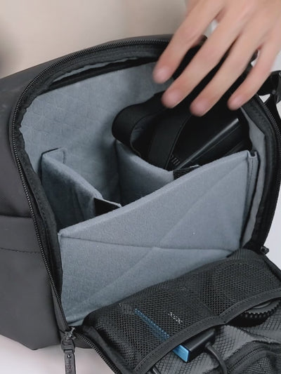 Der flexible Innenraum mit abnehmbarer Trennwand bietet Platz für Kamera, Objektive und Zubehör.