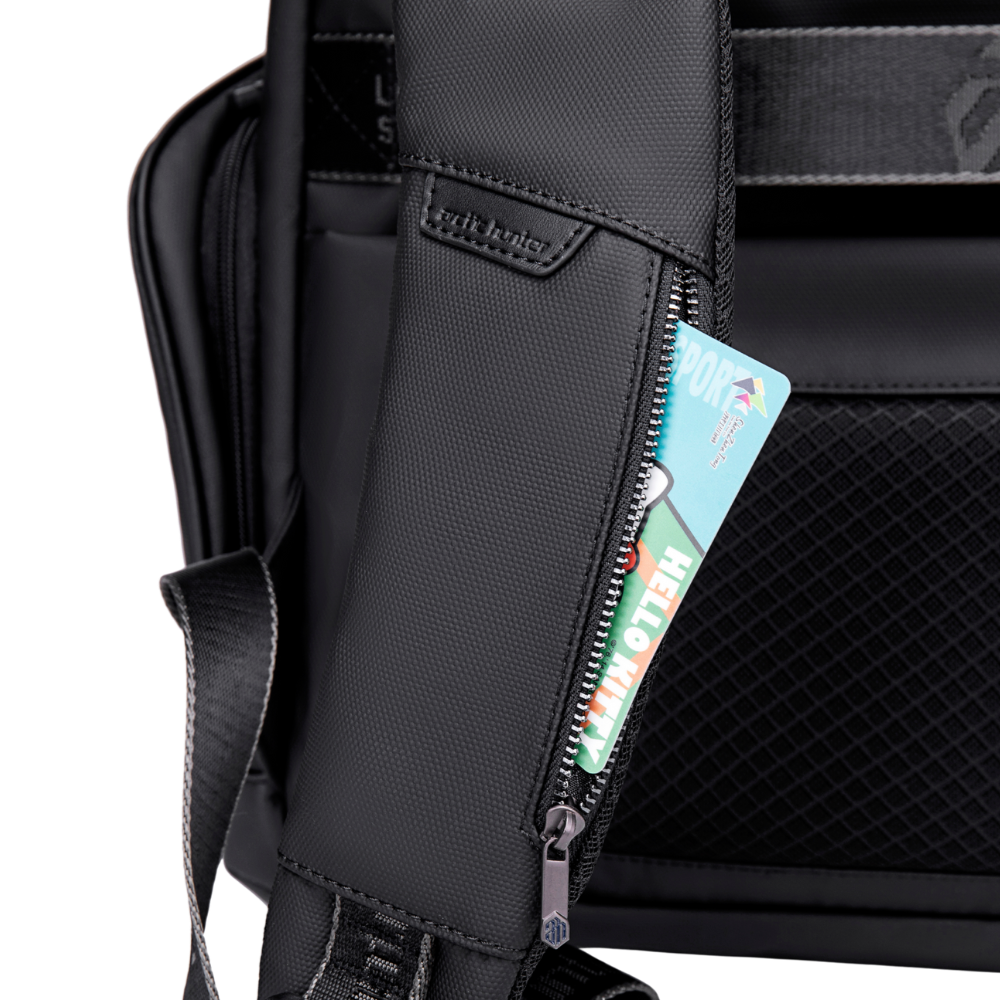 Bewahre Reisepass, Geldbörse oder Handy im Safe-Fach geschützt direkt am Rücken auf.